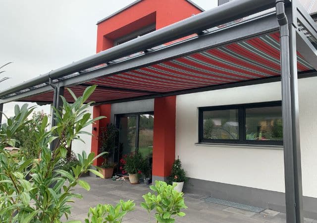 Die Querverstrebungen im Tuch sorgen außerdem für zusätzliche Stabilität und sind besonders reizvoll, wenn sie mit einem Beleuchtungssystem ausgestattet werden. Mit ergänzenden Front- und Seitenelementen ist eine Pergolamarkise ganzjährig nutzbar. Optional lassen sich Heizstrahler montieren, die in der kalten Jahreszeit für einen wohligen Aufenthalt auf Balkon oder Terrasse sorgen.